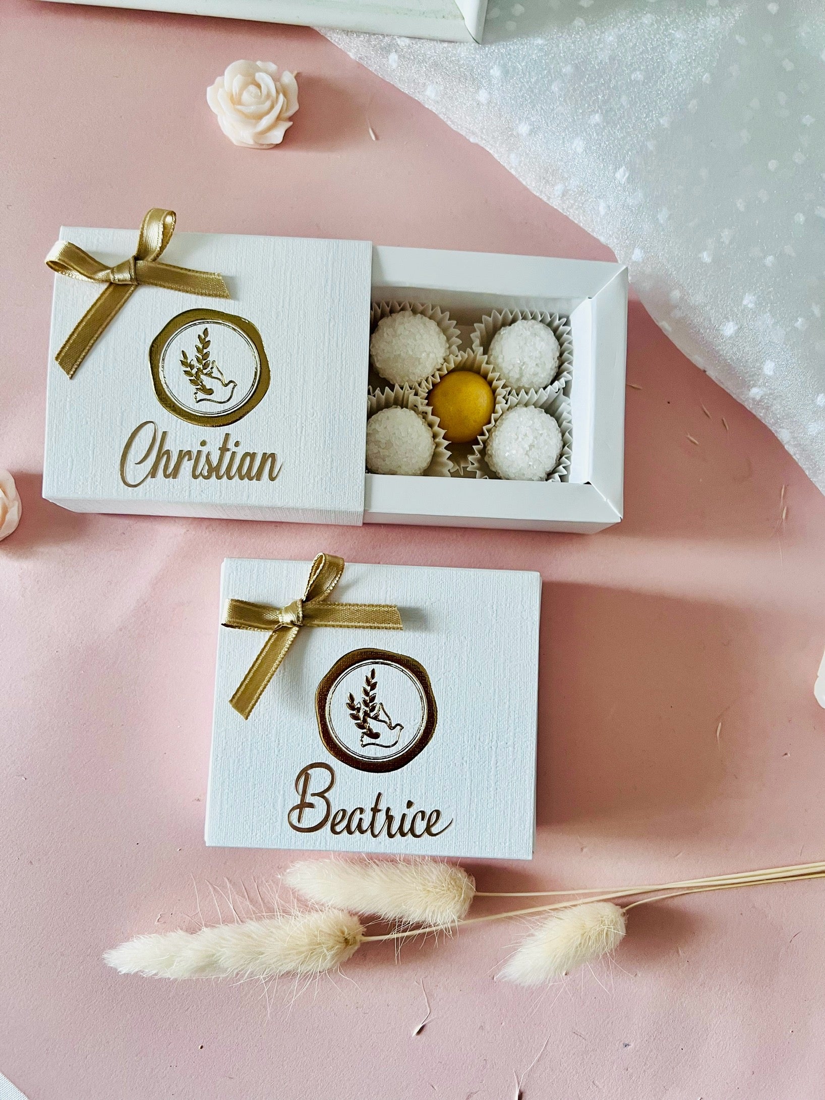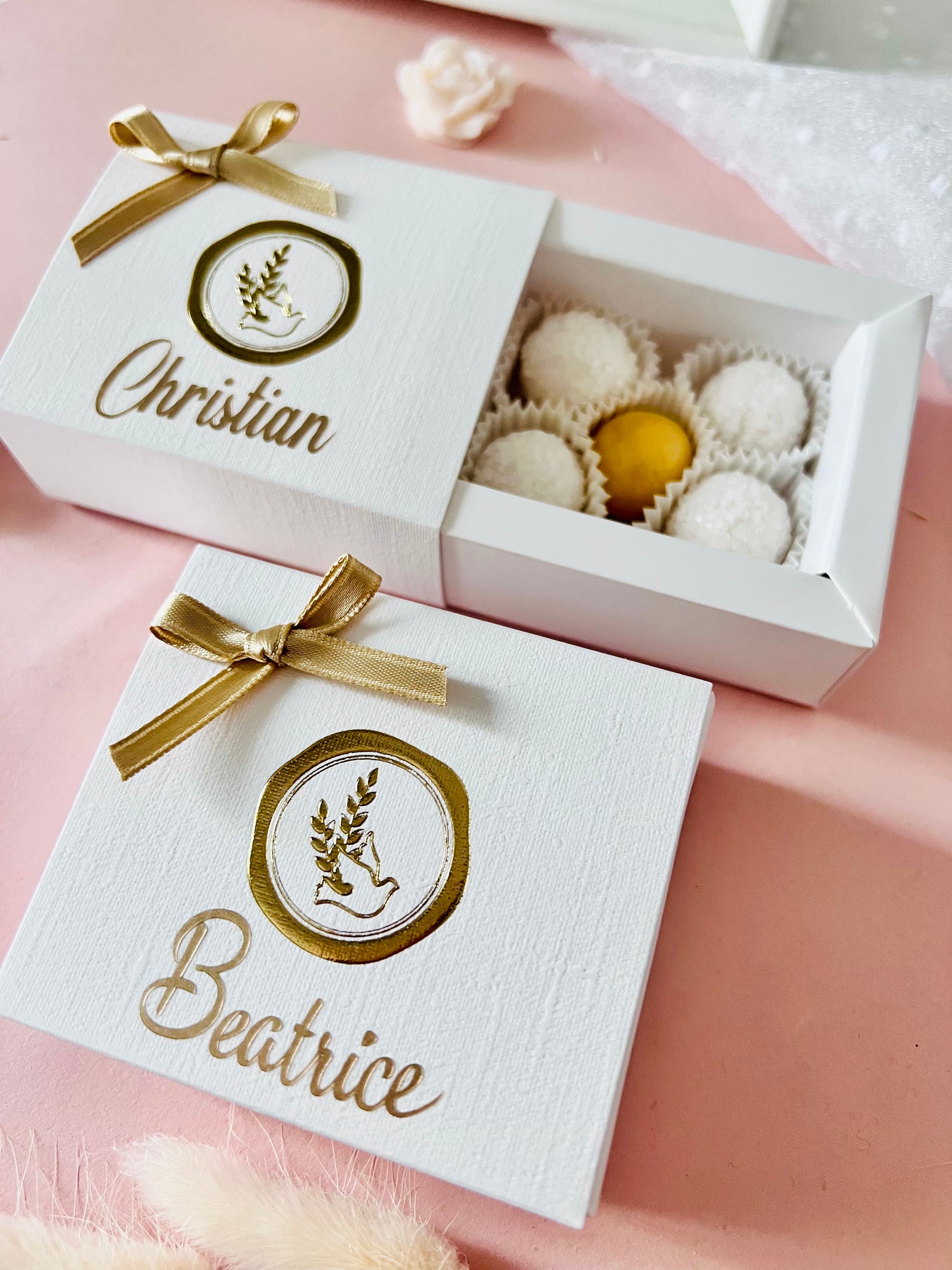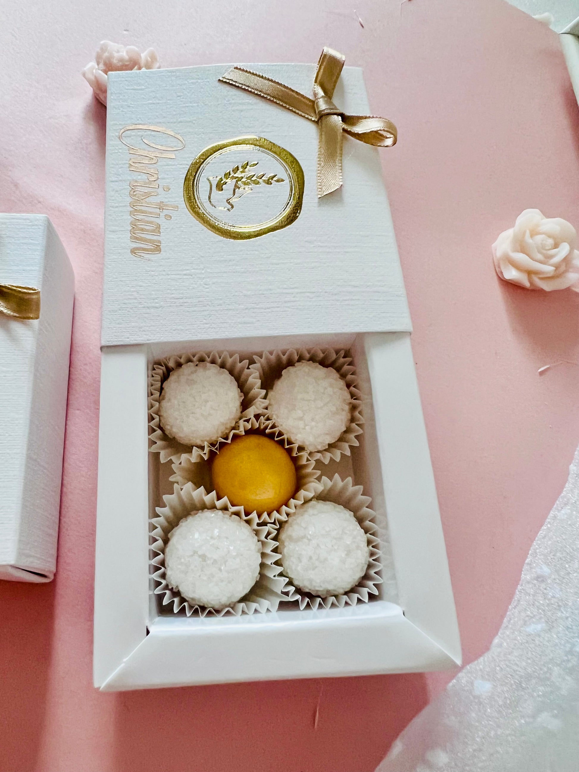 Box Degustazione Confetti bianca con Grafica tema cresima personalizzata con nome in vinile color oro e fiocchetto in raso. Un'Idea Regalo Elegante e Dolce. Composta da 5 confetti di alta qualità al cioccolato(4 tondi bianchi e 1 oro) adagiati su pirottini.