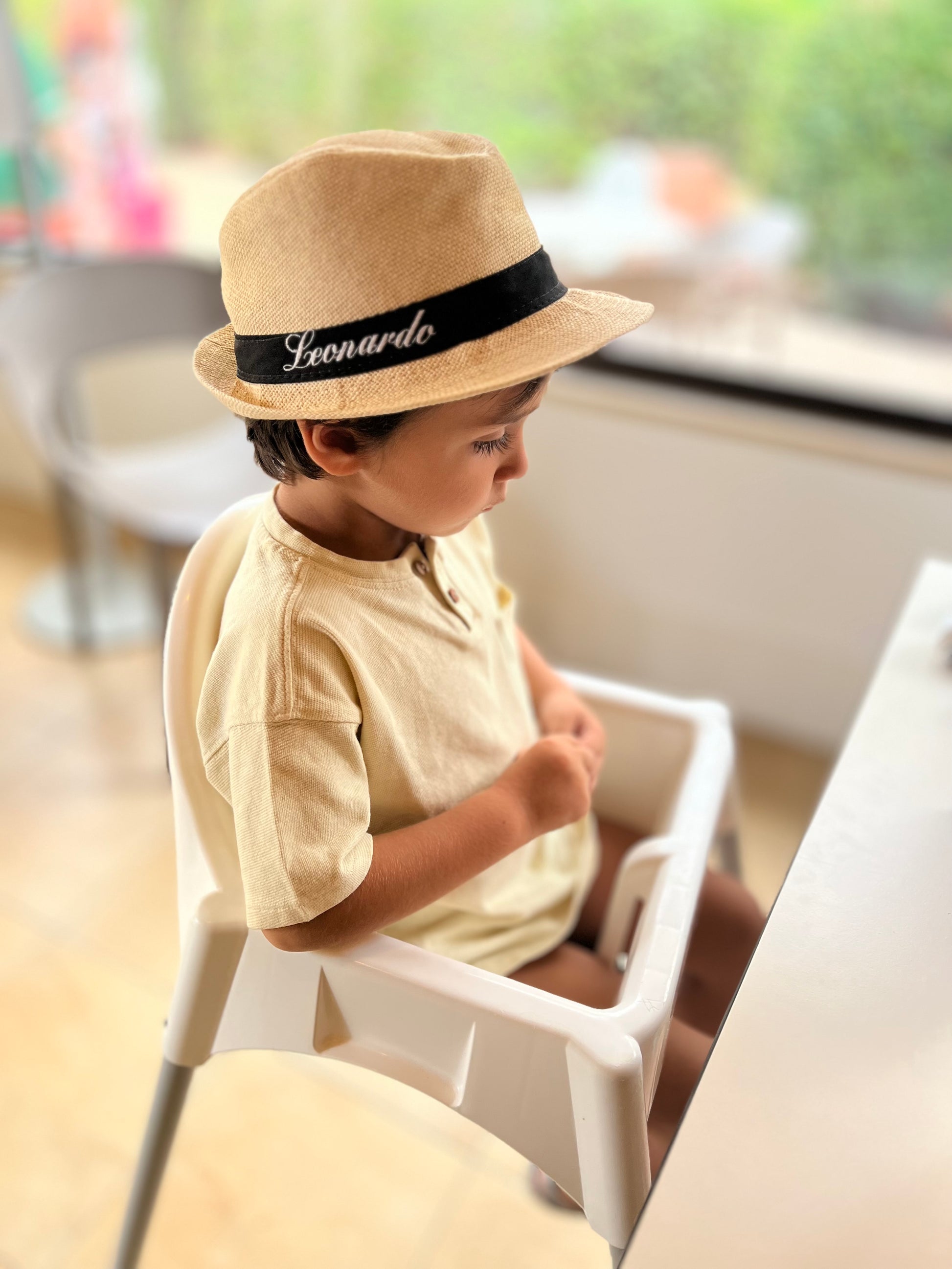 Proteggi il tuo piccolo con stile! Il nostro cappello in paglia per bambini è leggero, traspirante e perfetto per le giornate di sole, sia al mare che in città. La sua falda aiuta a schermare il viso e gli occhi, mentre il ricamo personalizzato con il nome del bimbo lo rende ancora più speciale.
