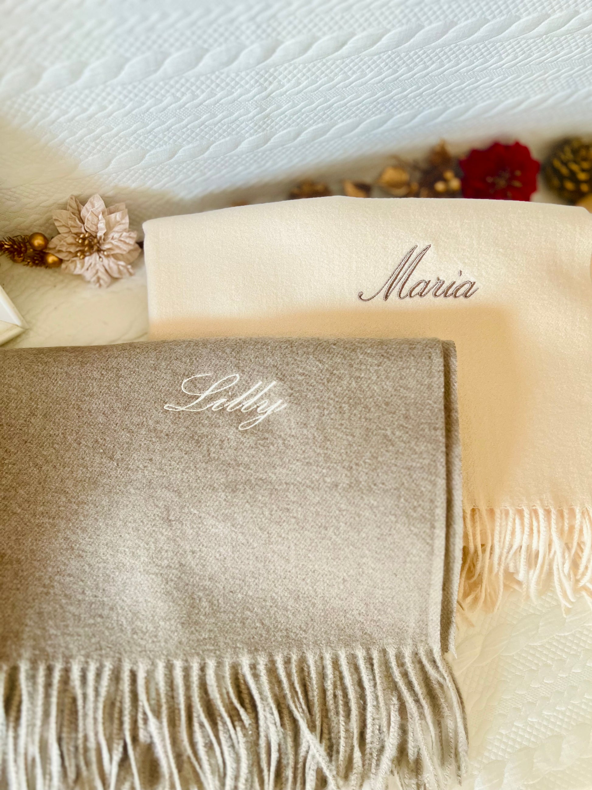 Scopri la nostra sciarpa personalizzata, l'accessorio ideale per aggiungere un tocco di stile e originalità al tuo guardaroba. Realizzata in un mix di lana-cashmere e viscosa che la rende morbida e setosa al tatto.Disponibili con e senza frange.