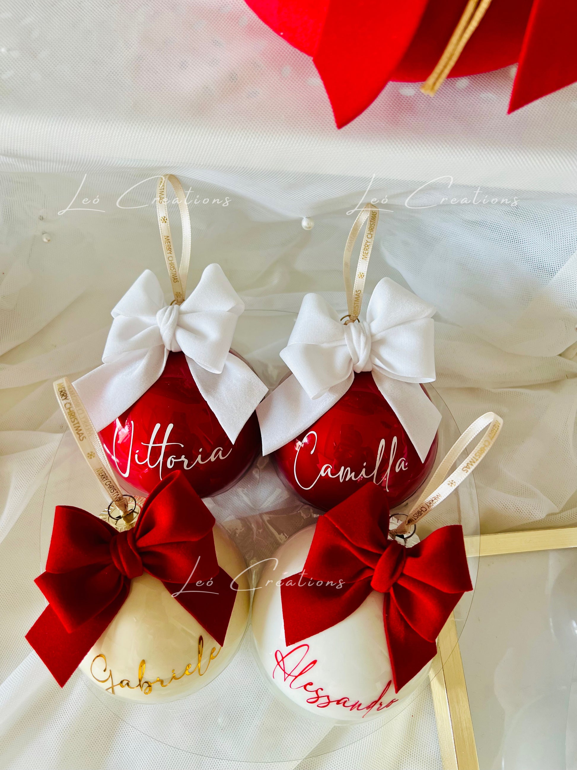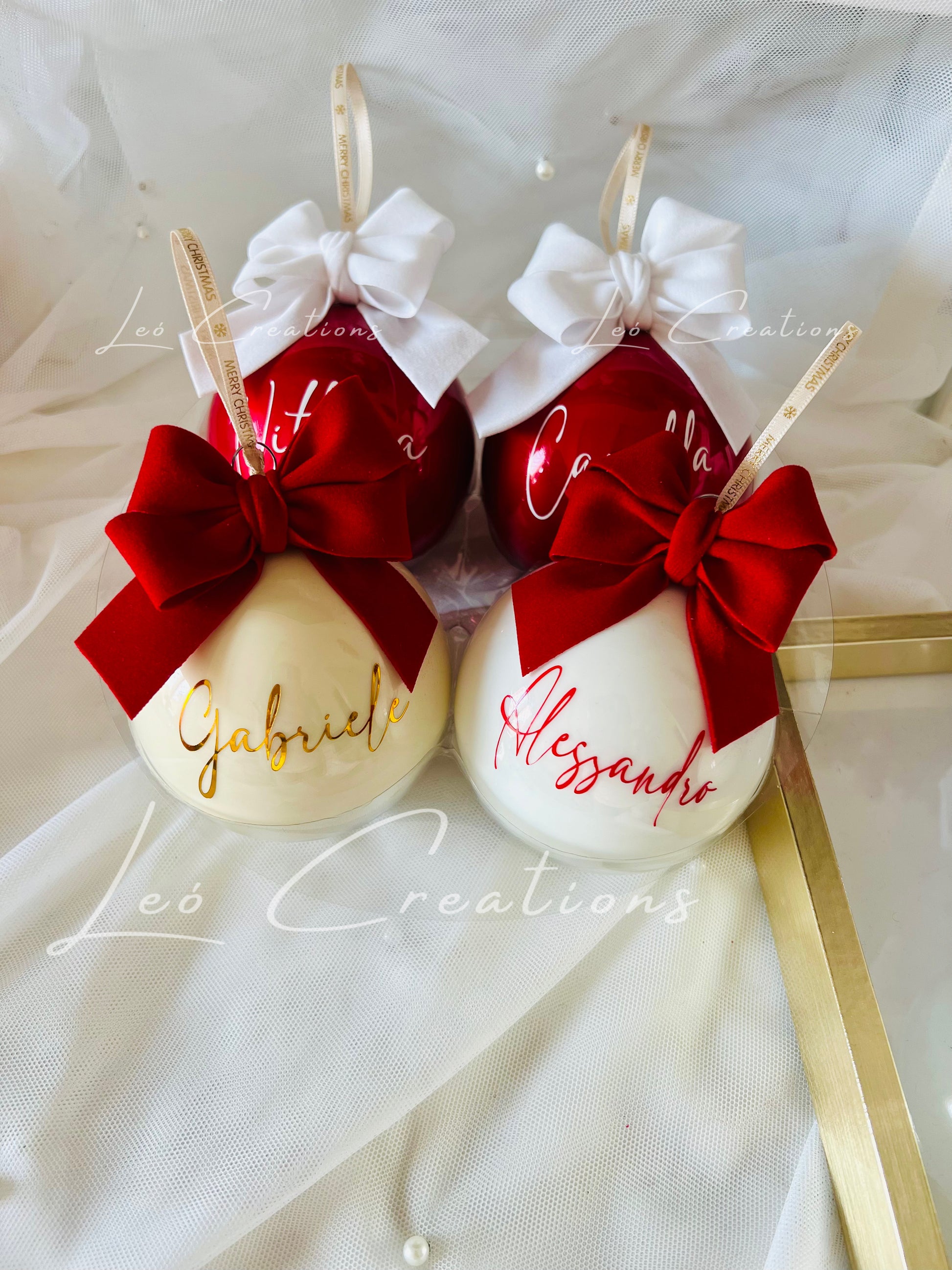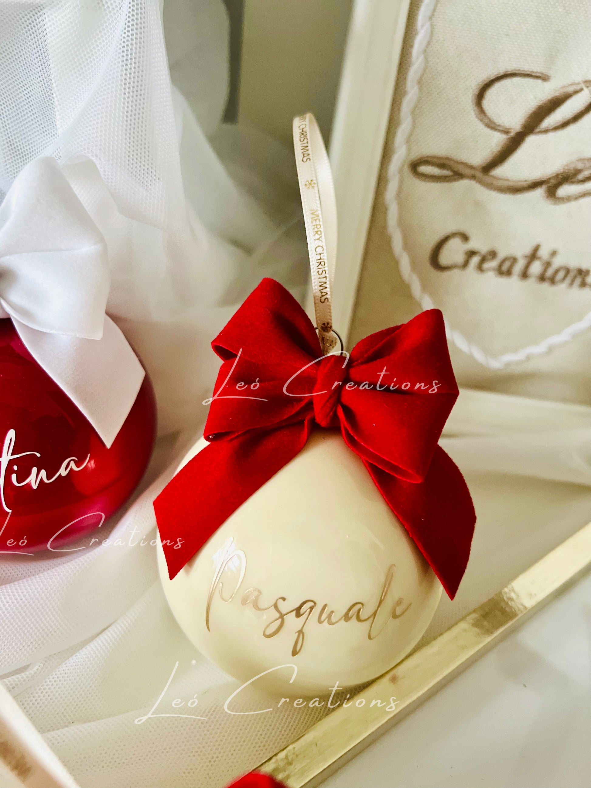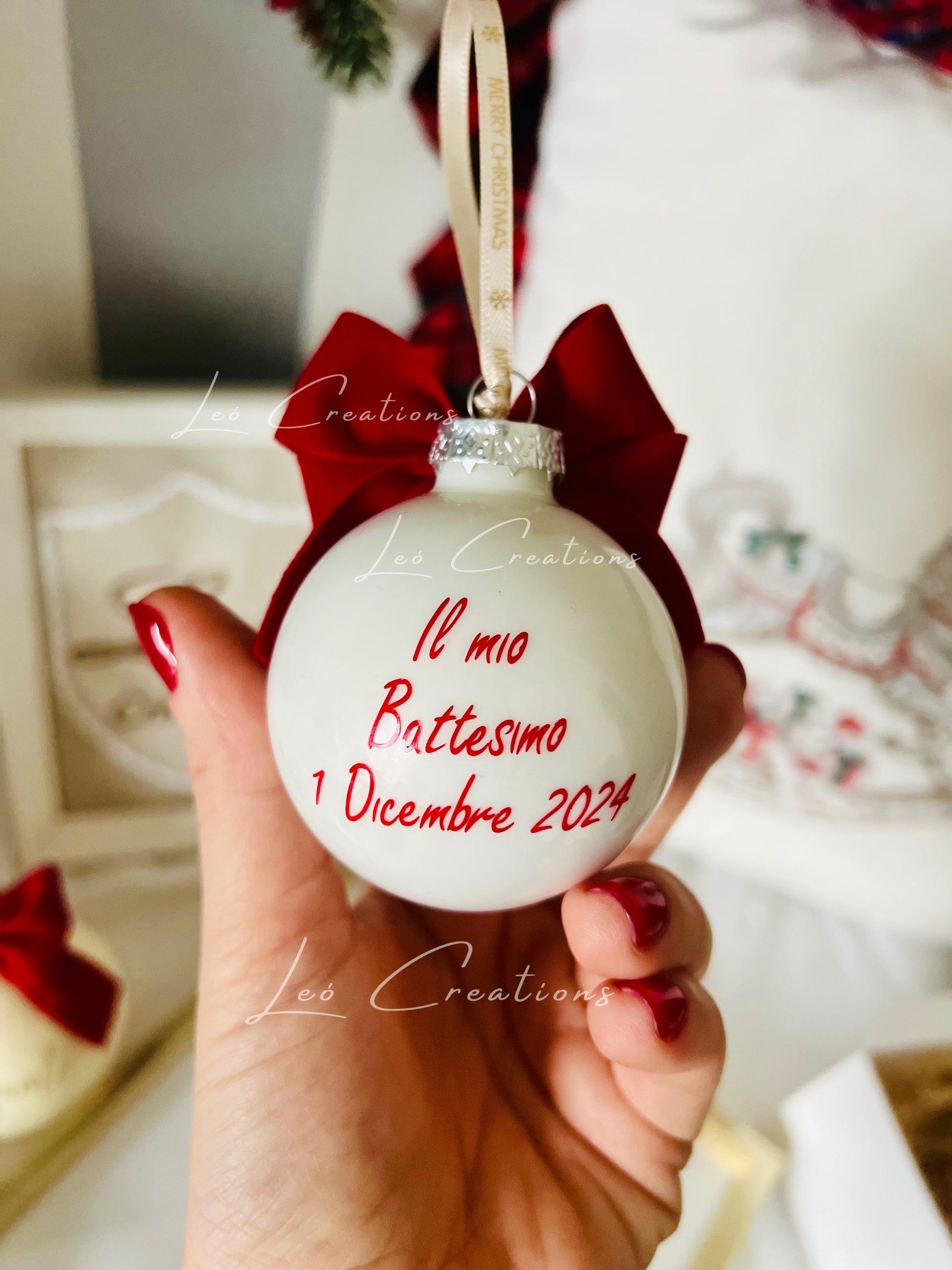 - Possibile variazione di colore come in foto( fiocco e nome azzurro,fiocco rosa e nome oro) o se ad esempio desideri la scritta oro sulla sfera rossa. Per queste variazioni scrivere nella BOX in basso.