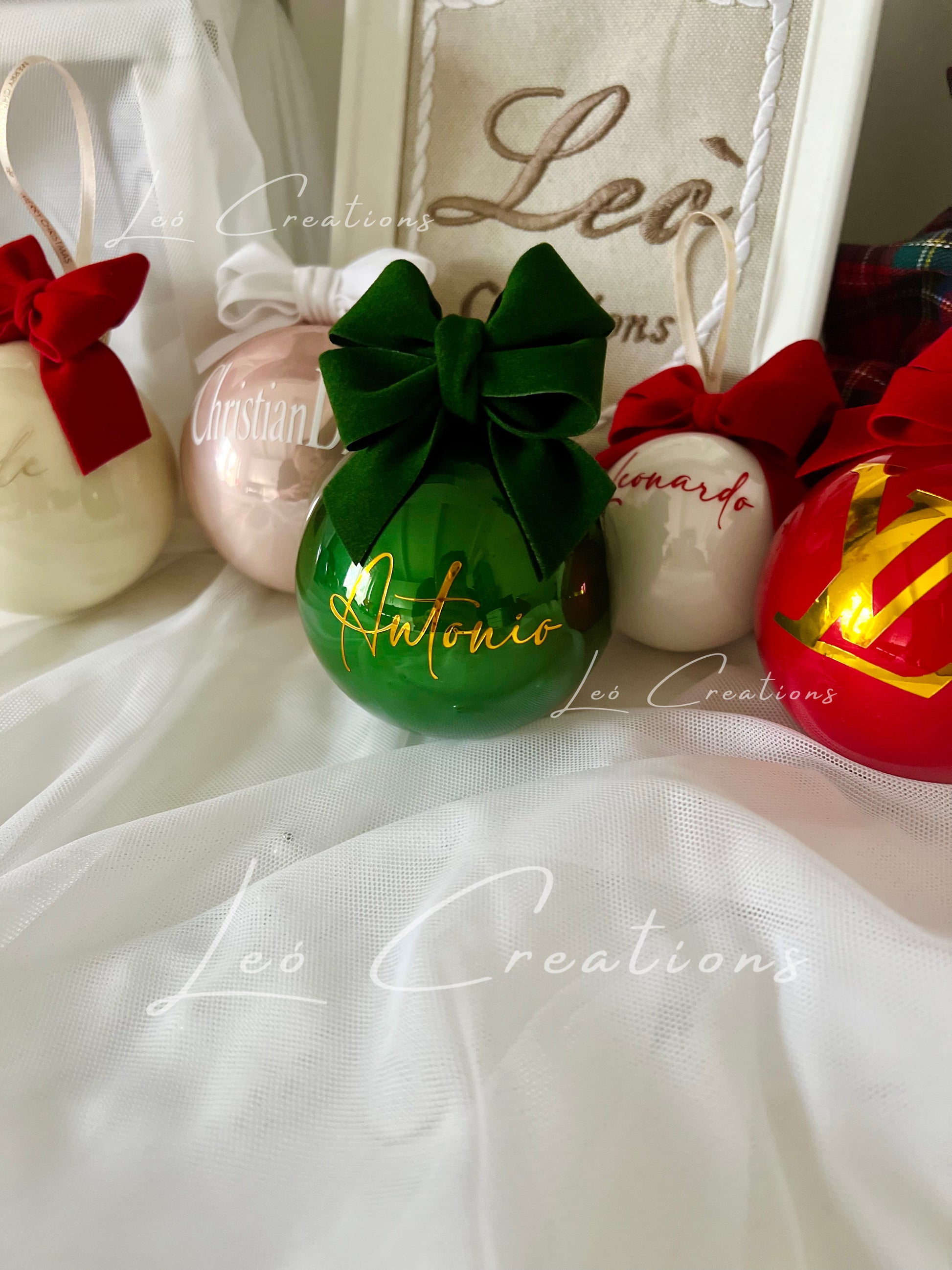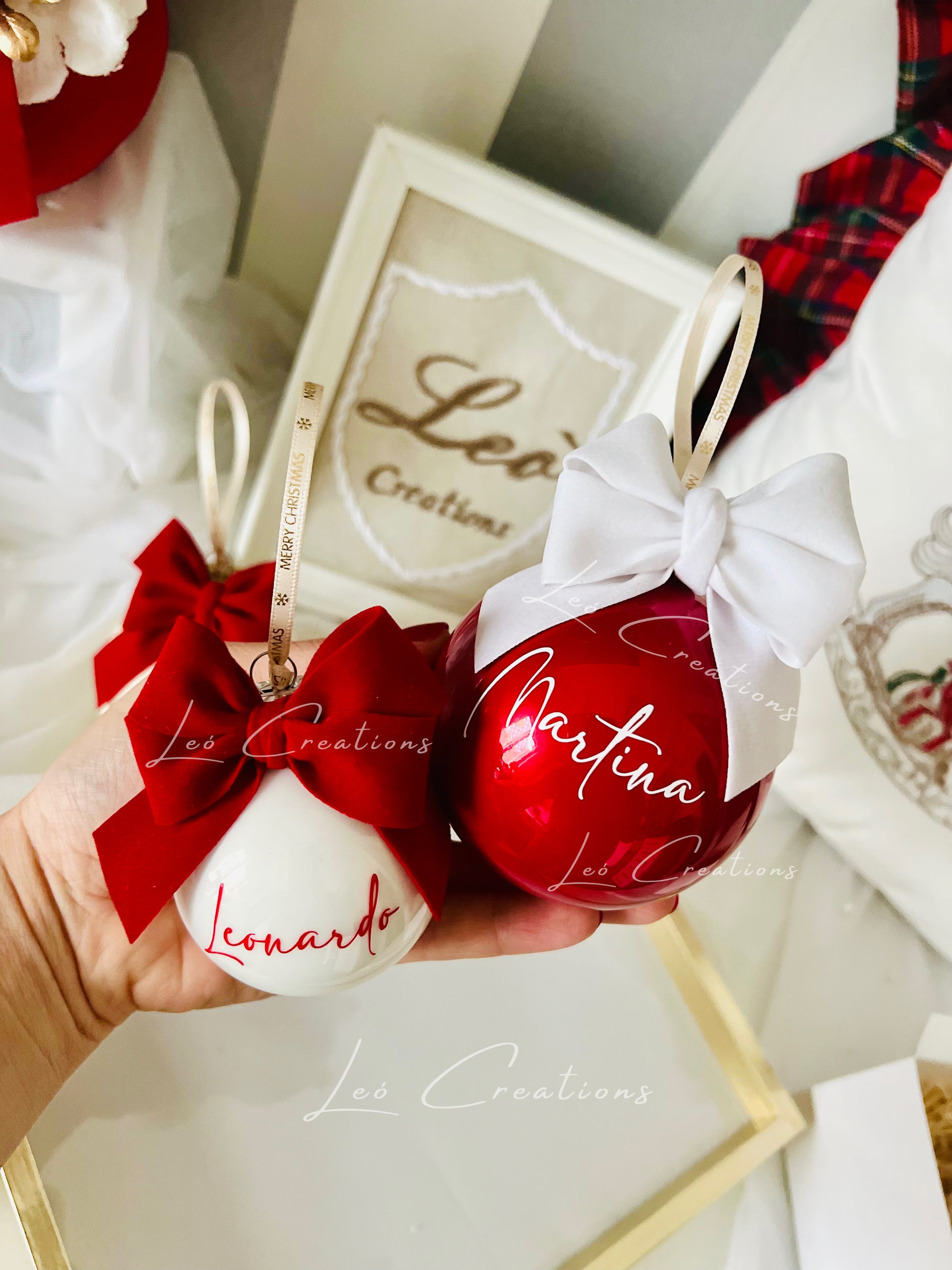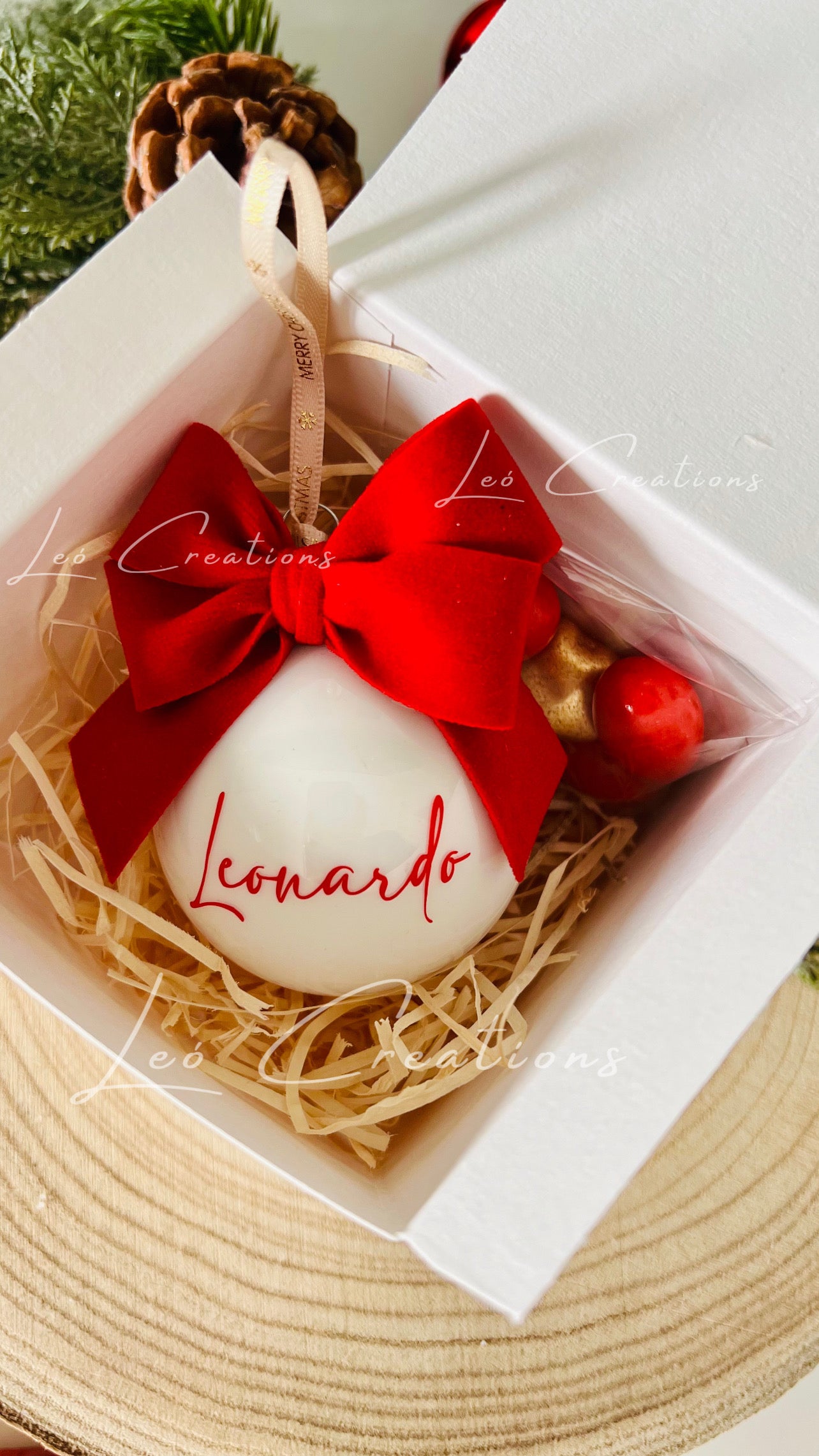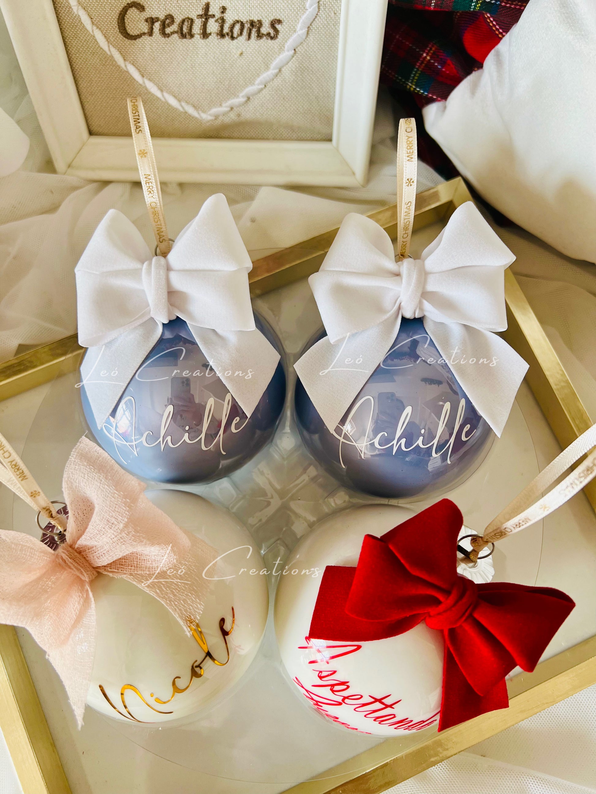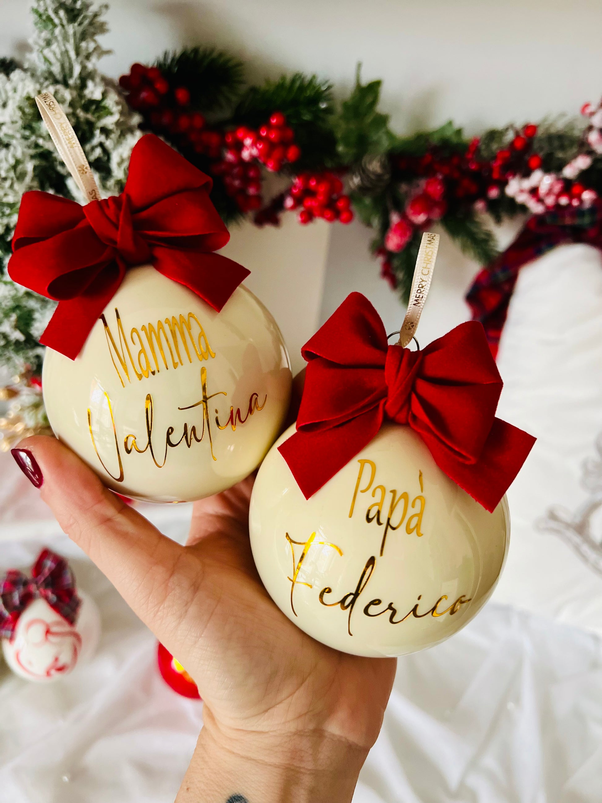 - Possibile variazione di colore come in foto( fiocco e nome azzurro,fiocco rosa e nome oro) o se ad esempio desideri la scritta oro sulla sfera rossa. Per queste variazioni scrivere nella BOX in basso.