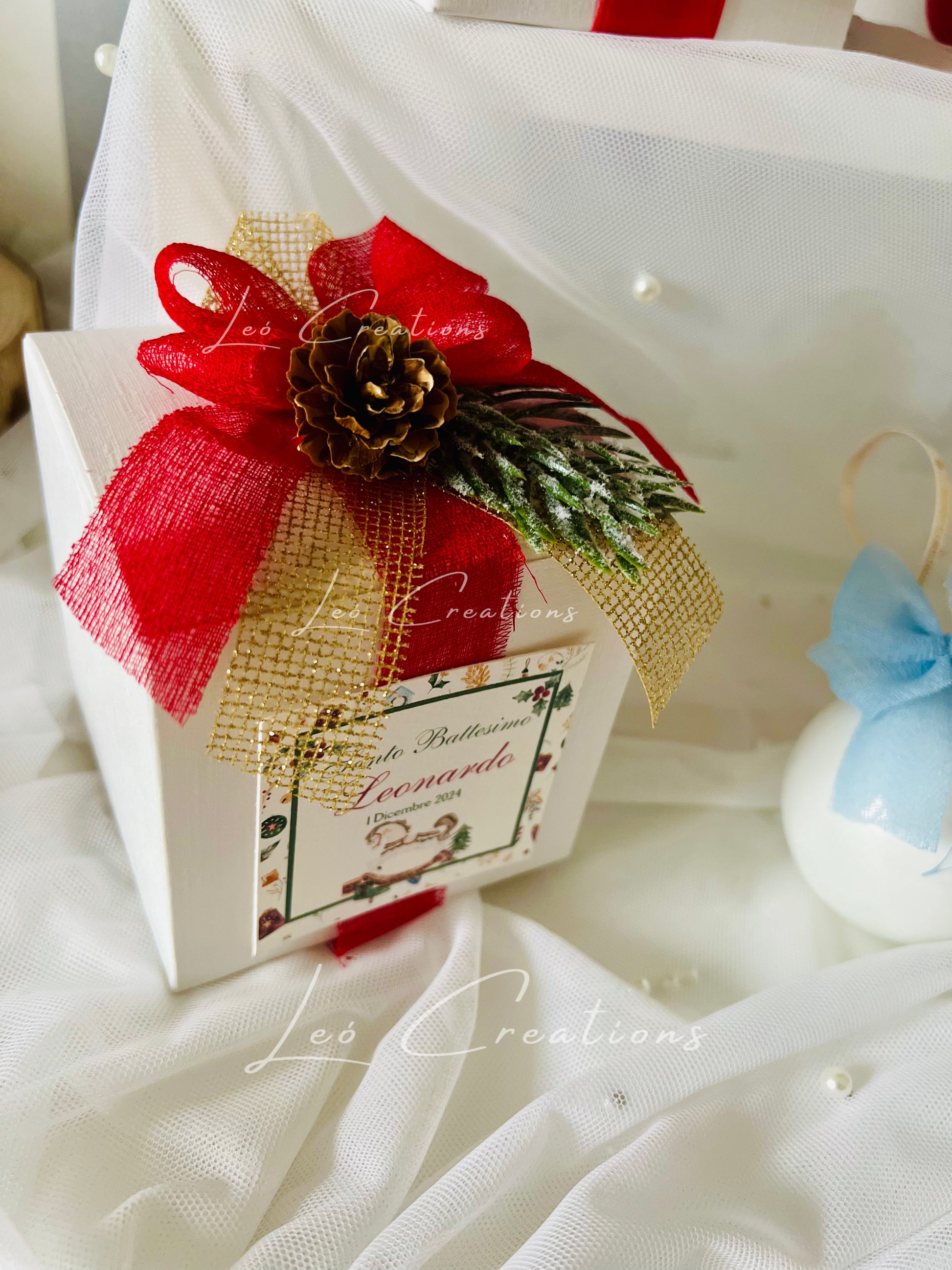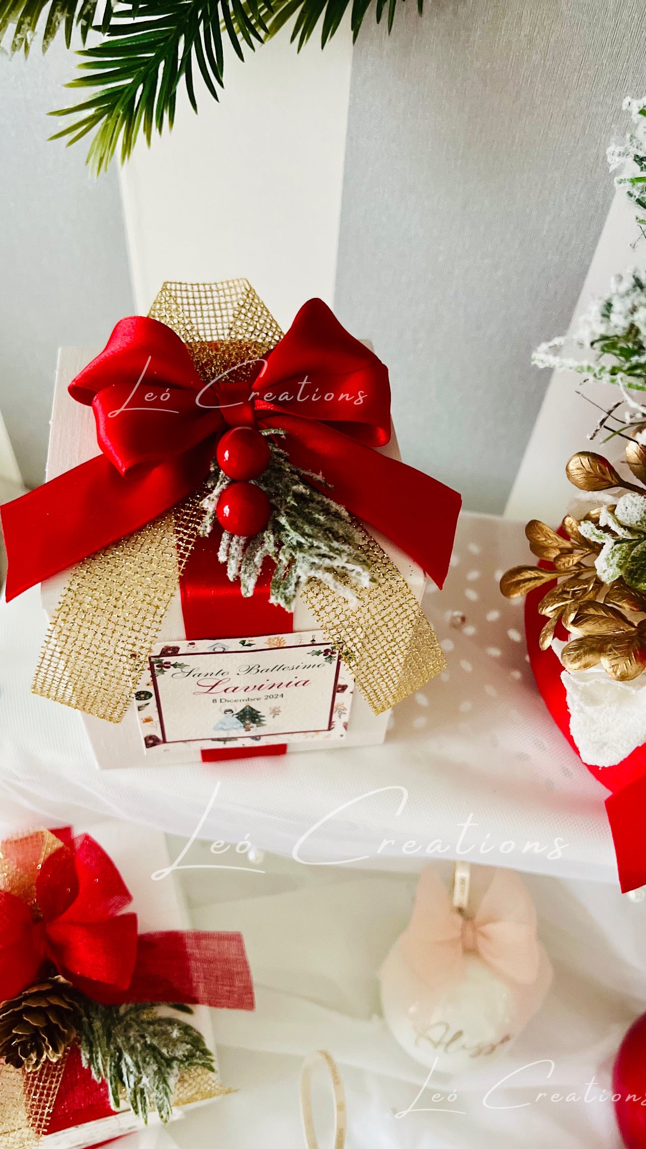 Versione Bomboniera: sfera confezionata in Box bianca con paglia decorativa ,ricca di elementi natalizi tra nastri in raso e lurex,bacche,pigne ed aghi di pino,5 Confetti ( 4 rossi e 1 stellina oro tutti al cioccolato) bigliettino con grafica personalizzata.