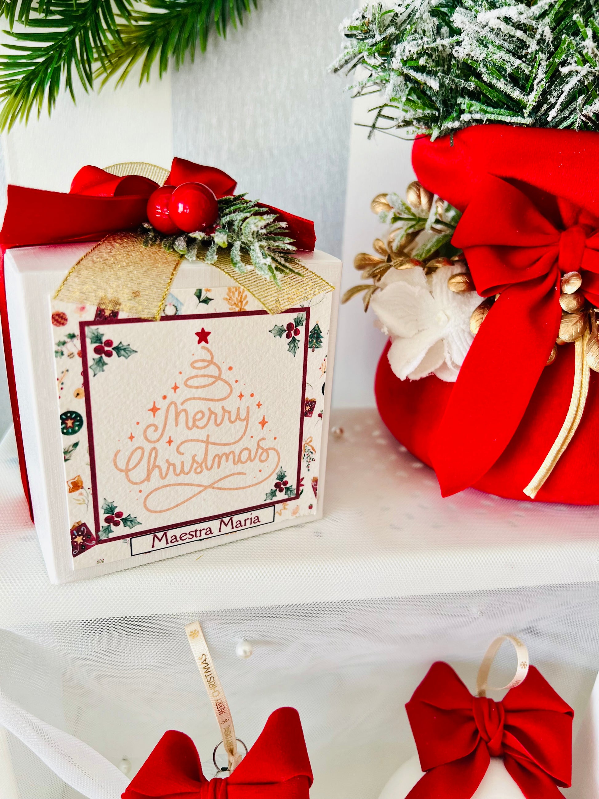 Versione regalo : sfera confezionata in una scatola bianca, ricca di particolari tra nastri ed elementi natalizi.