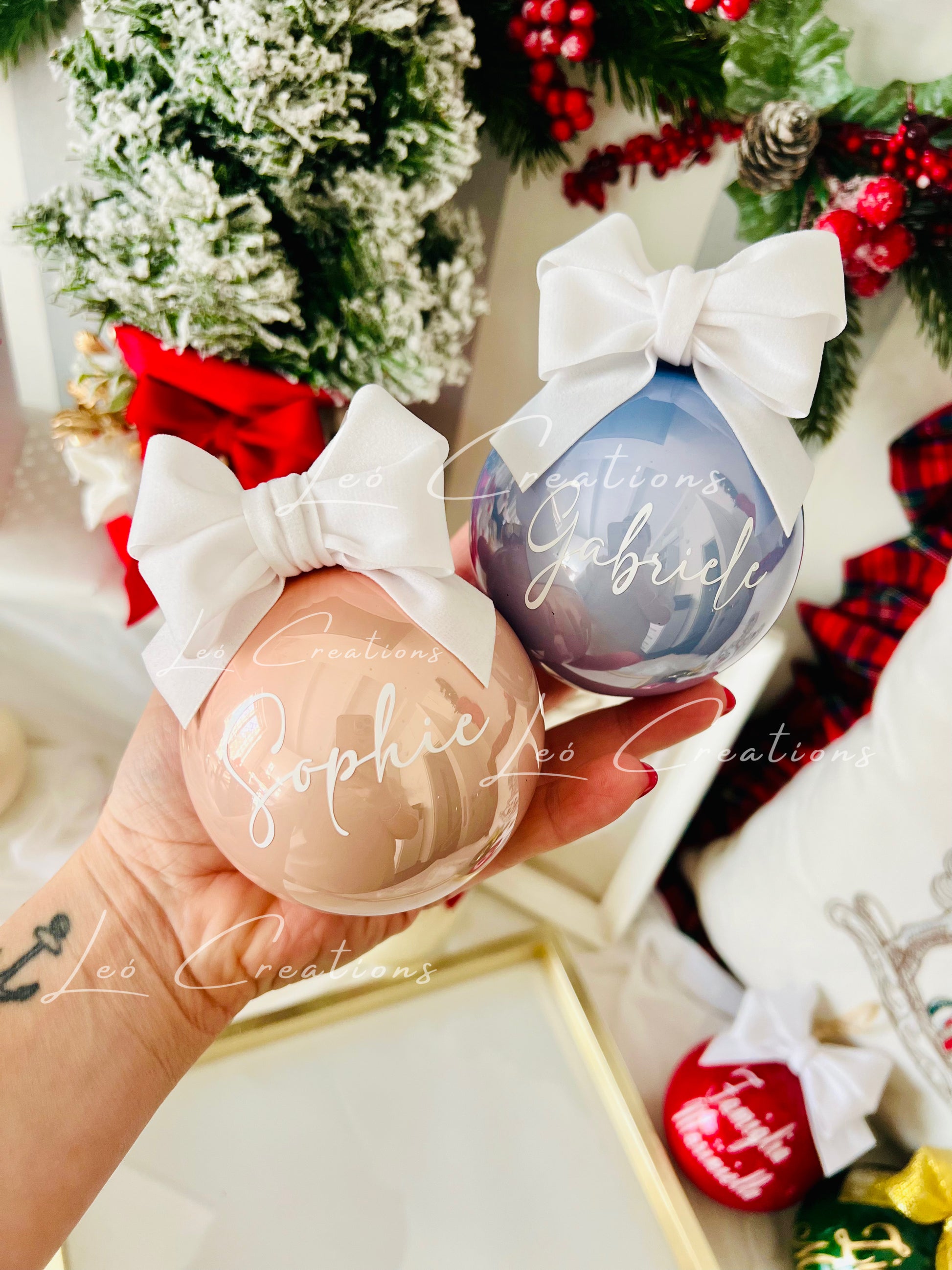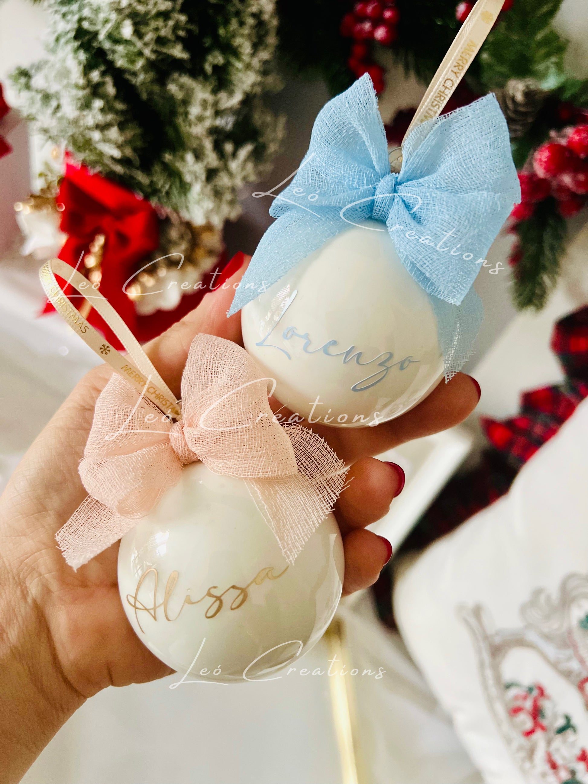 Esempio scegliete 2 sfere bianche con variazione nastro come in foto: 1 sfera con fiocco e nome azzurro LEONARDO -1 sfera fiocco rosa nome oro GIORGIA