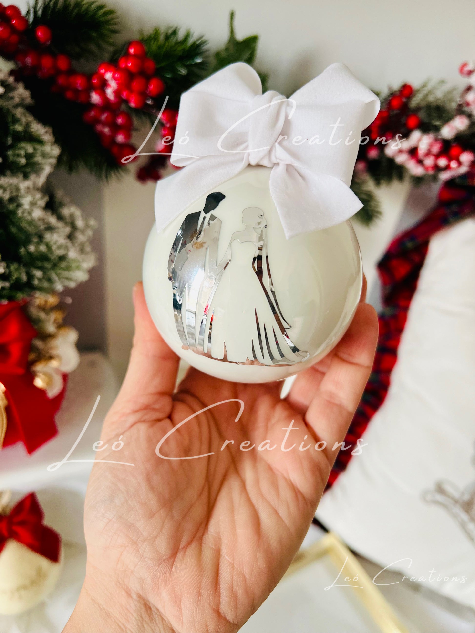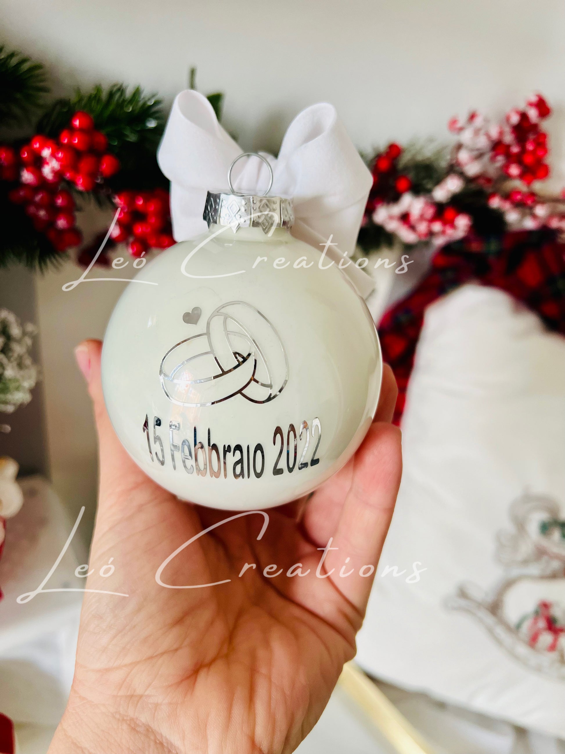 Sfera natalizia in vetro bianco, personalizzata da una coppia di sposi e sul retro doppia personalizzazione con due fedi e dati del matrimonio, impreziosita da un fiocco in velluto bianco.